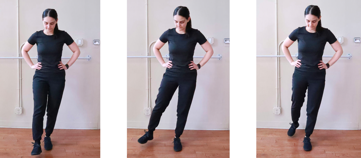 Stand on one leg to balance, while maintaining balance, kick your opposite leg forward and to the side. Repeat for 2 sets of 10 repetitions.