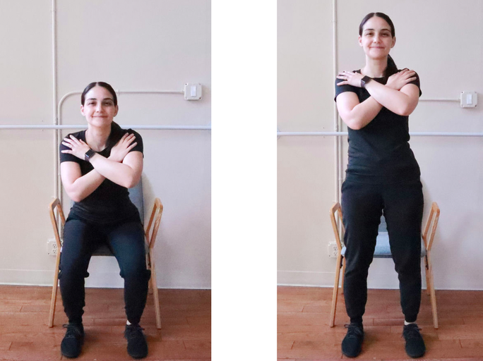 Stand in front of a chair with your feet hip width apart. Slowly sit down onto the chair. Sit down completely and then stand back up without using your hands if possible. Repeat for 2 sets of 10 repetitions.
