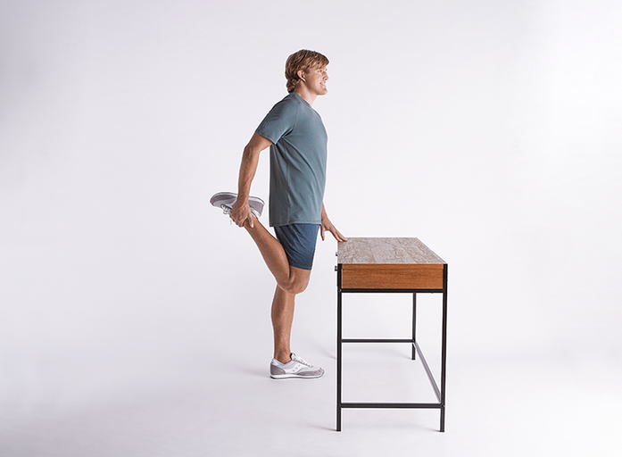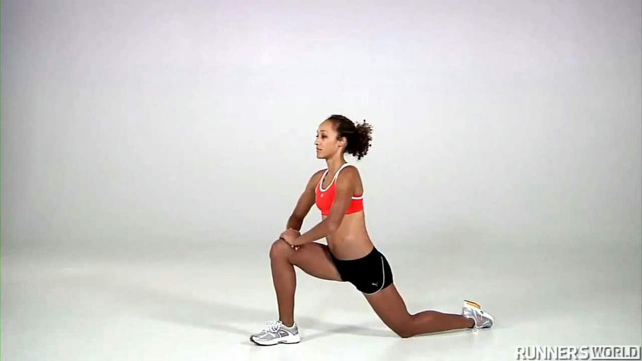 Stand on one leg and bring the opposite heel towards your buttocks, holding the ankle with your hand. Keep your knees close together, feeling a stretch in the front of the thigh and hip. - Lunge Stretch: