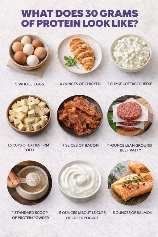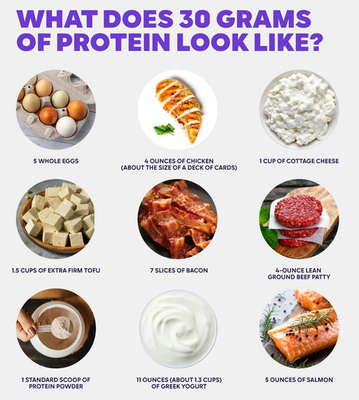 How much protein? Approximately one gram of protein per one pound of body weight. So if I was 150lbs, I would aim for at least 150 grams of protein per day. If you are not sure what that realistically looks like, I have attached a visual chart: