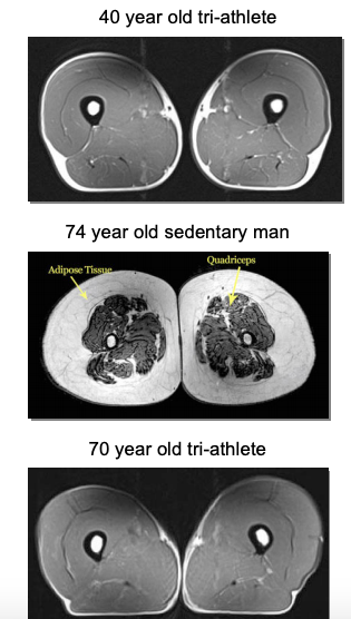 The most incredible finding was that strength did not decline with age and muscle mass was nearly unchanged in the older population; just take a look at the incredible images of the thigh muscles below. The 40 & 70 year old athlete’s MRIs look identical!