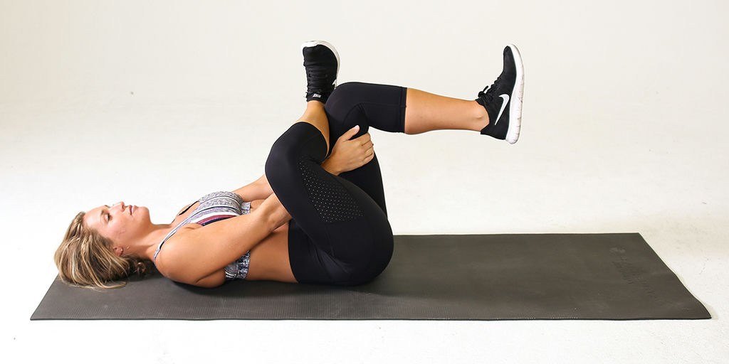 While lying down, cross one ankle over the opposite knee, forming a "4" shape. This stretch is fantastic for targeting the piriformis muscle and other deep hip rotators. To get a deeper stretch you can draw your opposite leg in towards your chest, as seen in the photo. - Standing Quad Stretch: